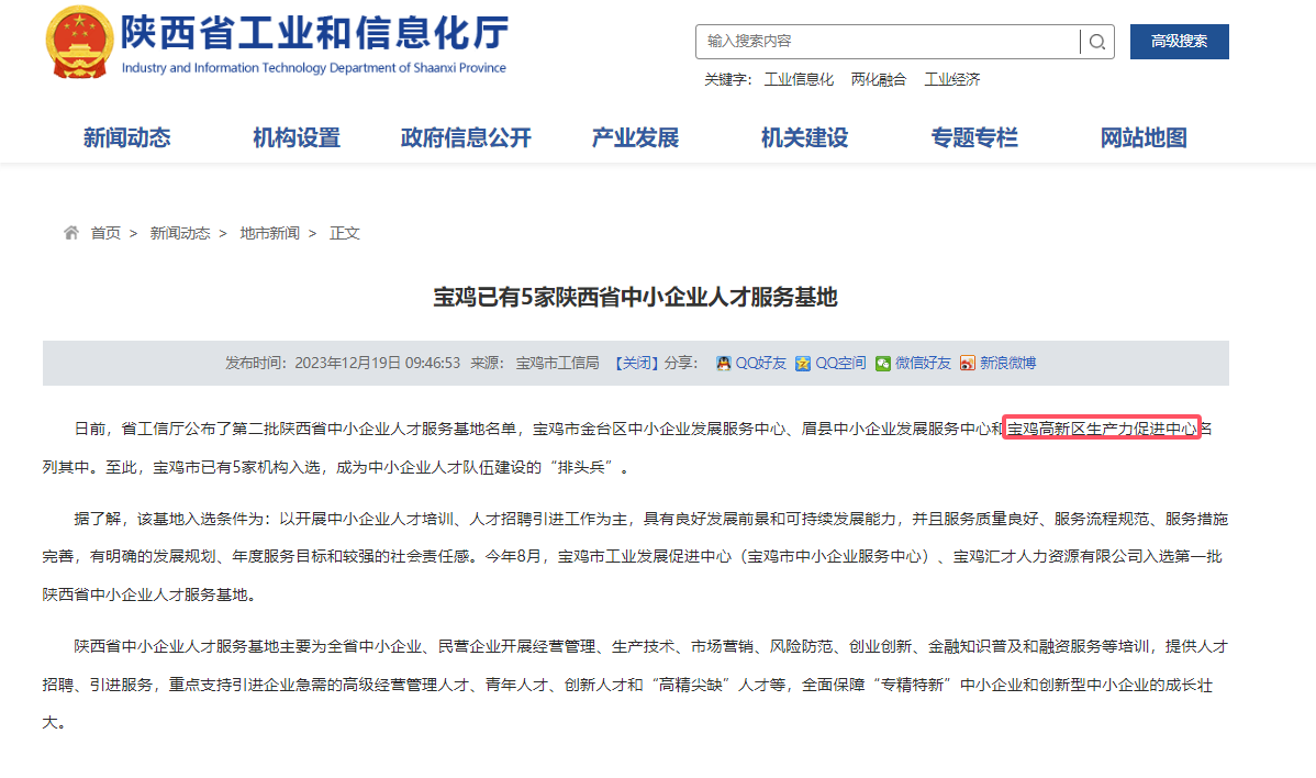 日前,省工信厅公布了第二批陕西省中小企业人才服务基地名单,宝鸡市金台区中小企业发展服务中心、眉县中小企业发展服务中心和宝鸡高新区生产力促进中心名列其中。至此,宝鸡市已有5家机构入选,成为中小企业人才队伍建设的“排头兵”。